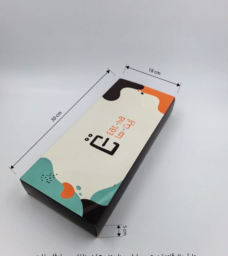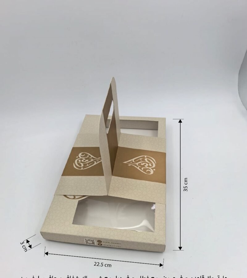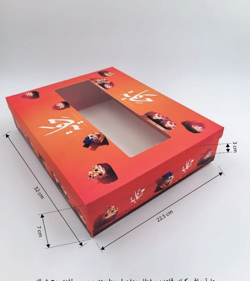 علبة حلا قاعده حرف عريض مع غطاء حرف دبل مع شباك شفاف و هاف سليف بيد مطبوعه بتصميم العميل مع سلوفان خارجي مطبفى مقاس العلبه 35*22.5*3