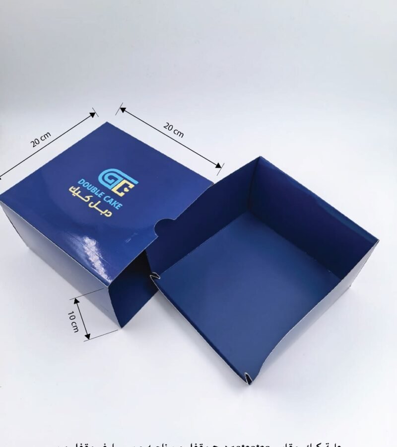 علبة كيك مقاس 20*20*10 درج مقفل من ناحيه و سليف مقفل من ناحيه مطبوعه وجهين مع سلوفان وجهين