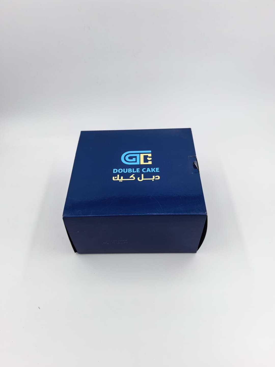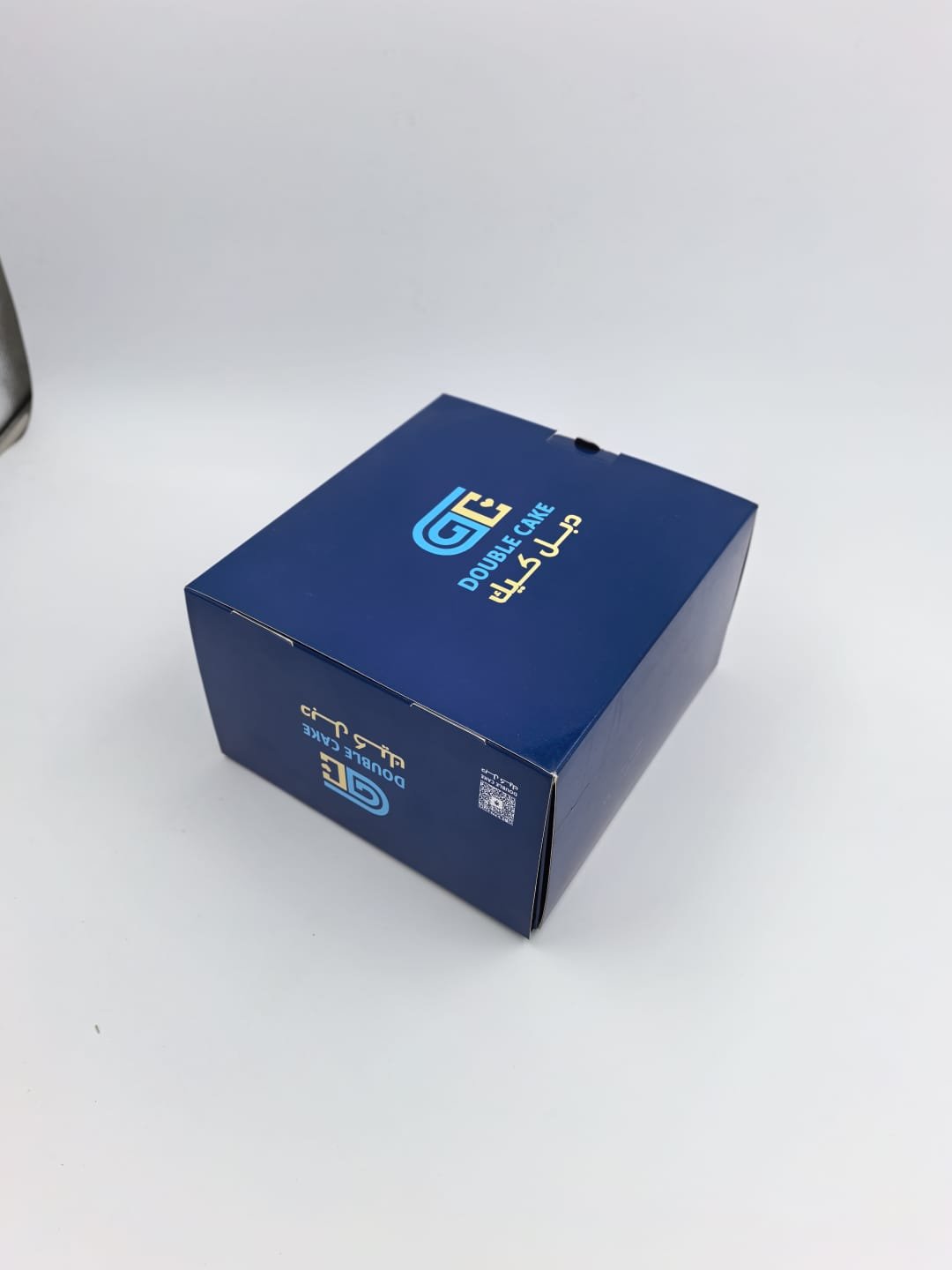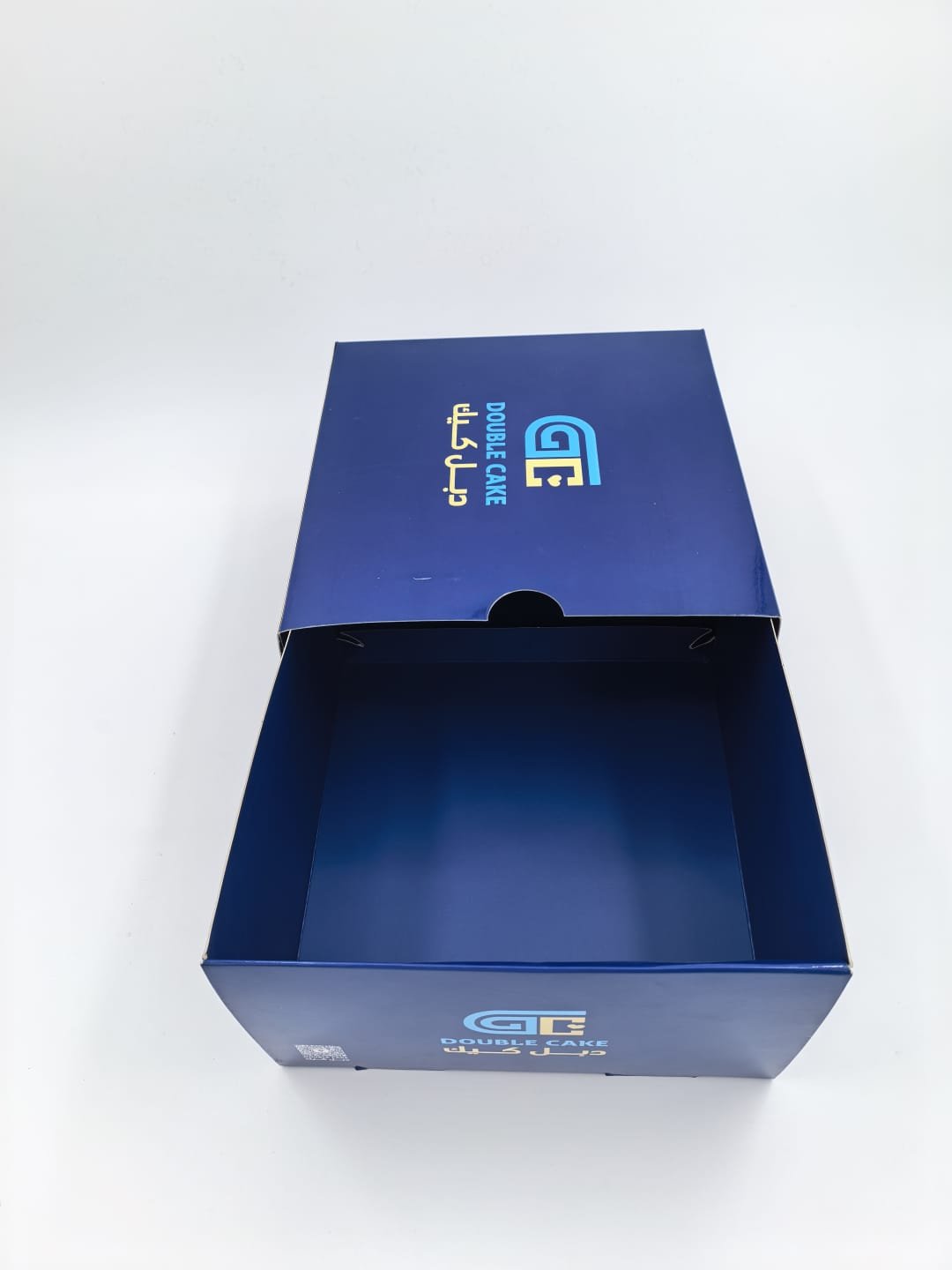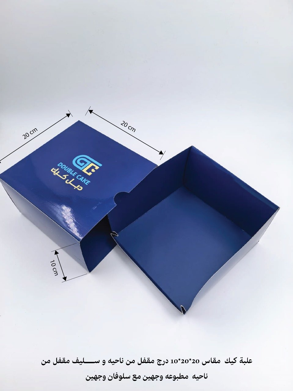 علبة كيك مقاس 20*20*10 درج مقفل من ناحيه و سليف مقفل من ناحيه مطبوعه وجهين مع سلوفان وجهين