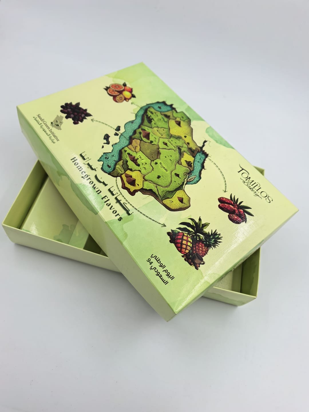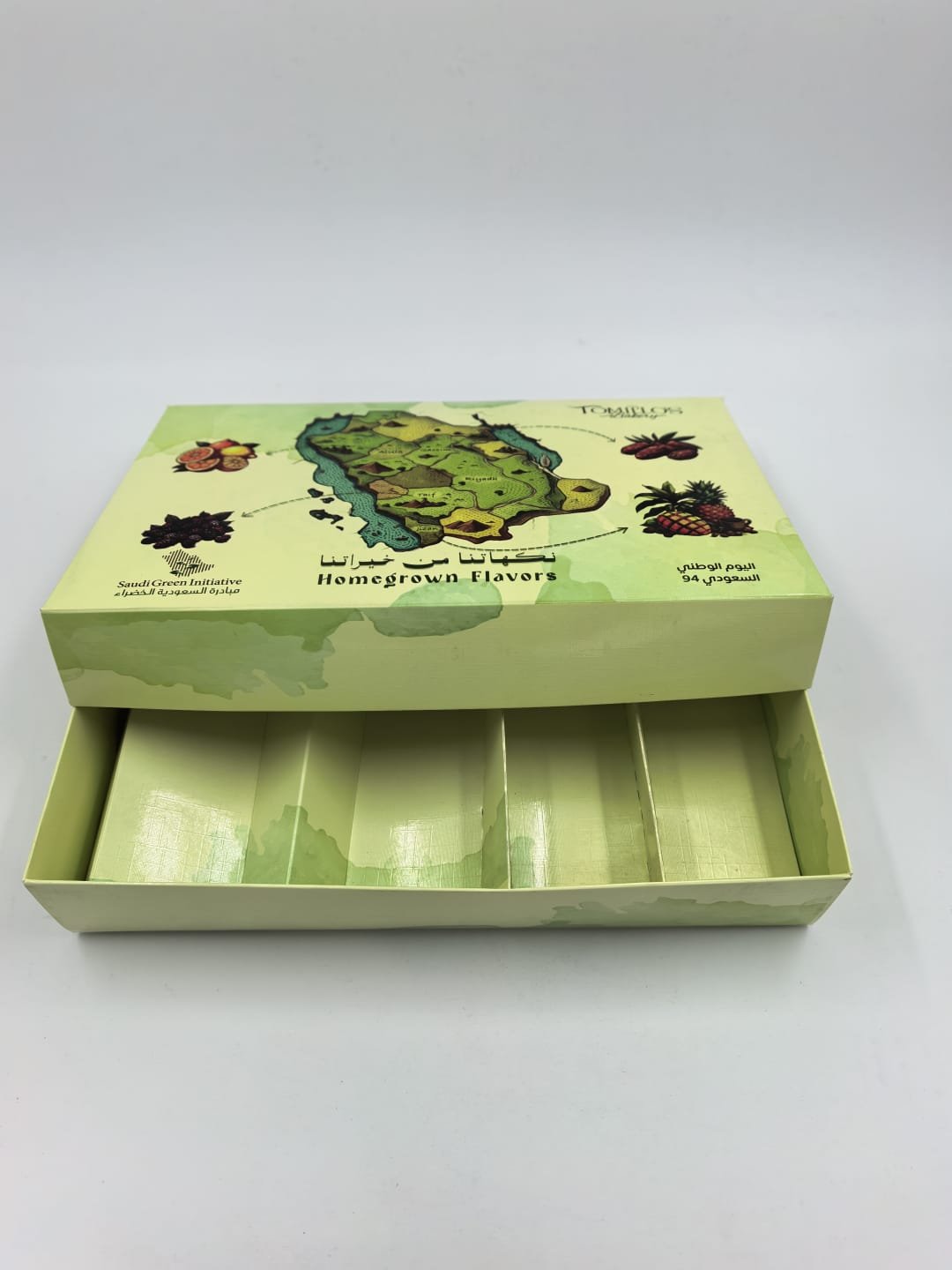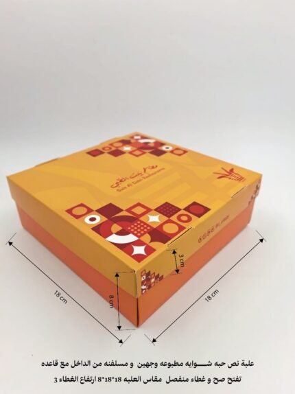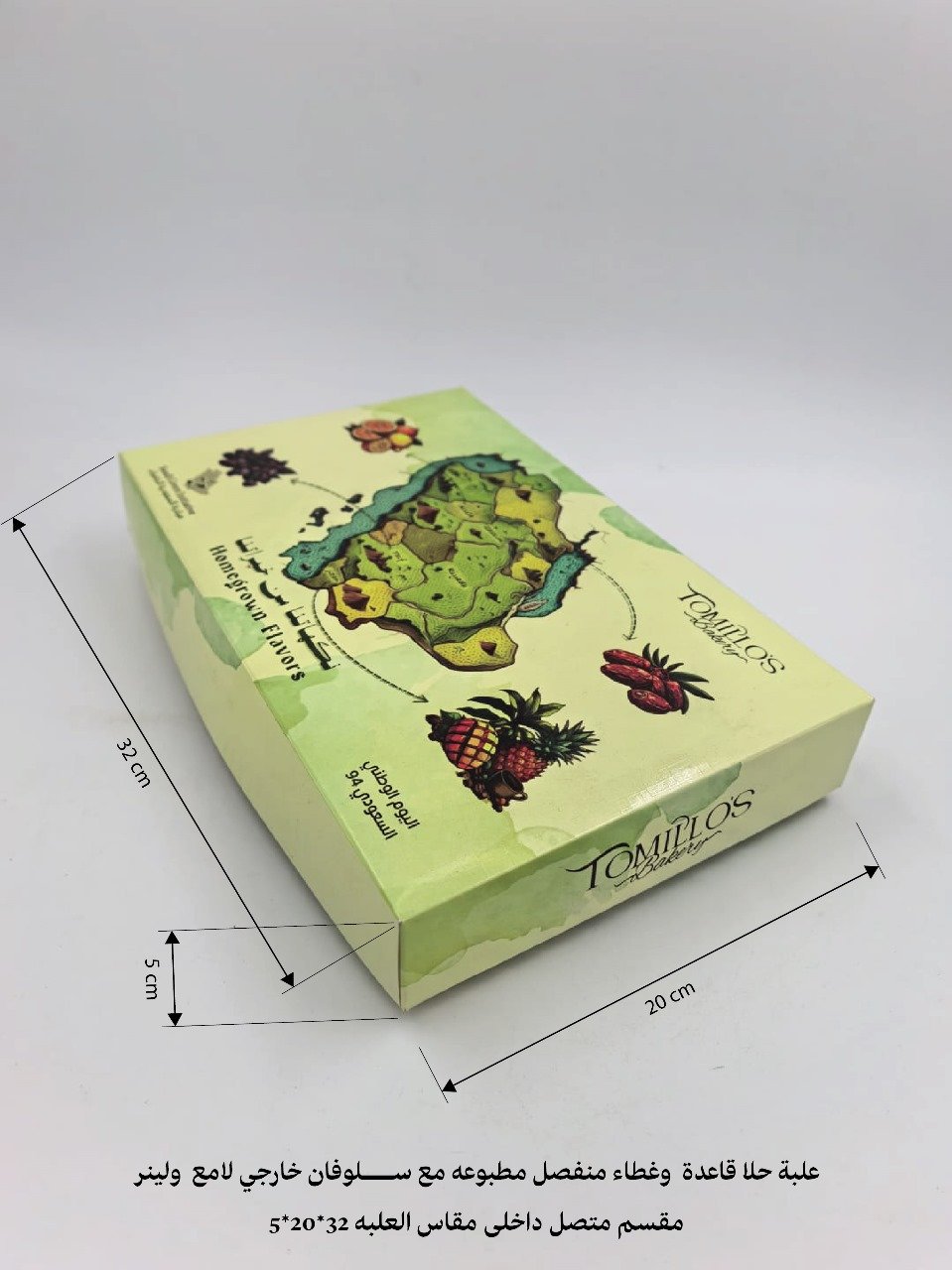 علبة حلا قاعده وغطاء منفصل مطبوعه مع سلوفان خارجي لامع و لينر مقسم متصل داخلى مقاس العلبه 32*20*5